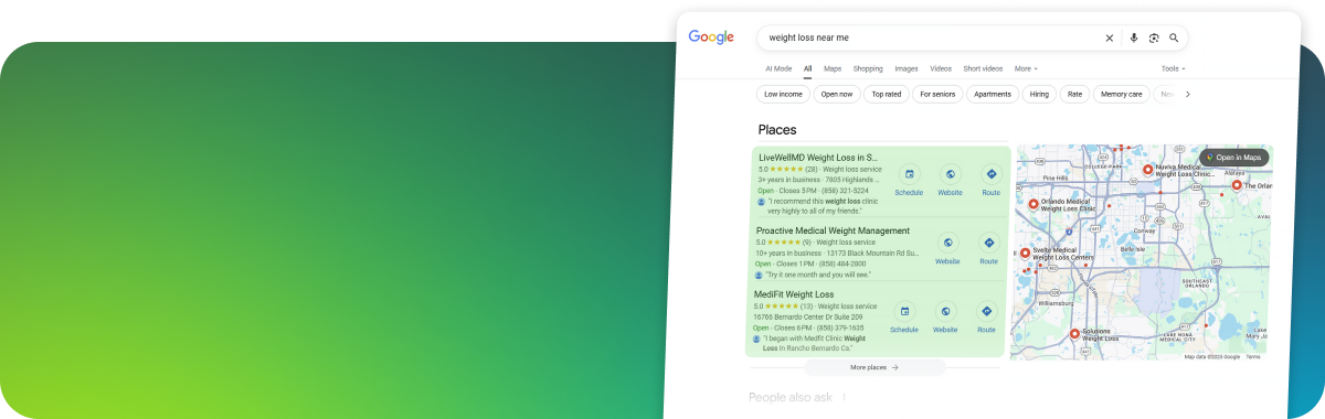 Most agencies either focus on paid ads that stop working the moment you stop paying, or SEO that takes forever with no guarantees. We're doing both - but strategically. Google Maps SEO puts you in front of people actively searching for your service i.e. "weight loss clinic near me" or "dermatologist near me." (high intent visitors). With proper retargeting, we ensure you're staying top-of-mind with every warm lead and past patient so they come to you!